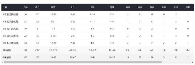 全锦赛第二阶段翟若云场均30分钟,拿到20.2分6.8篮板1助攻0.4抢断,命中率39.8%,三分命中率36.6%,翟姐再被严防死守下还是拿到场均20+的数据,如果没有她山西女篮这第三场胜利都拿不到。